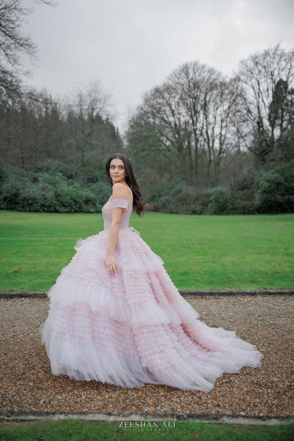 An extravagant blush pink soft tulle layered gown with an off shoulder neckline.